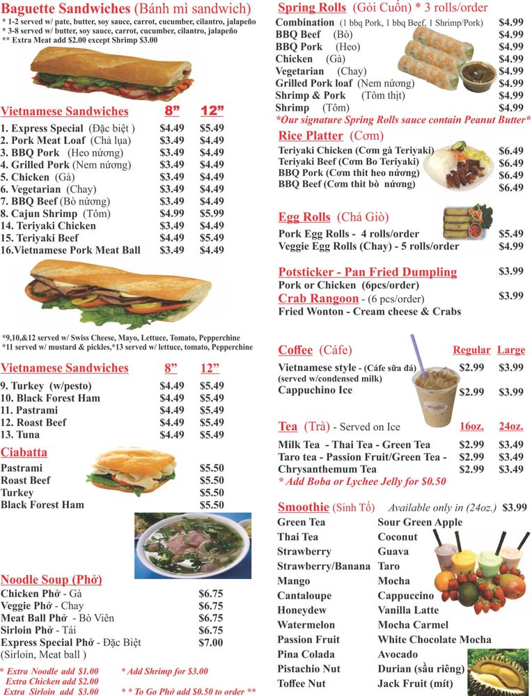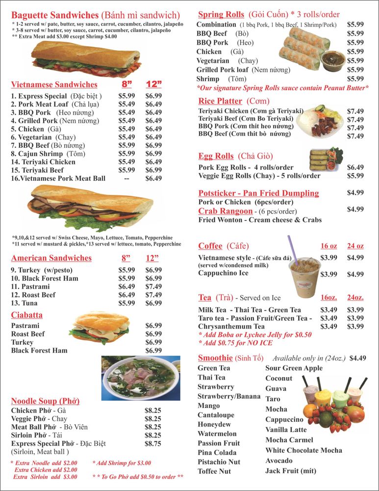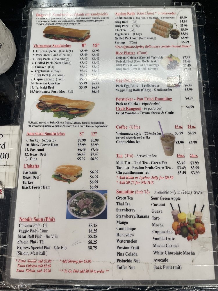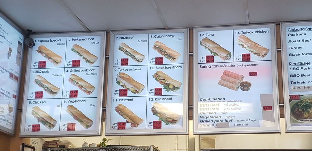 Baguette Express, located in San Bernadino, CA, offers a variety of Vietnamese cuisine with a focus on delicious banh mi sandwiches and spring rolls. Customers rave about the flavorful BBQ pork banh mi and the different protein options for the spring rolls. The baguette bread is a standout, adding a perfect crunch to each bite. The owners are praised for their kindness and excellent customer service. With options for takeout, delivery, and catering, Baguette Express is a convenient choice for a quick and tasty meal. The cozy atmosphere and friendly staff make it a favorite among locals, with many recommending a visit to support this charming mom-and-pop shop. For a satisfying and authentic Vietnamese dining experience, Baguette Express is a must-try.